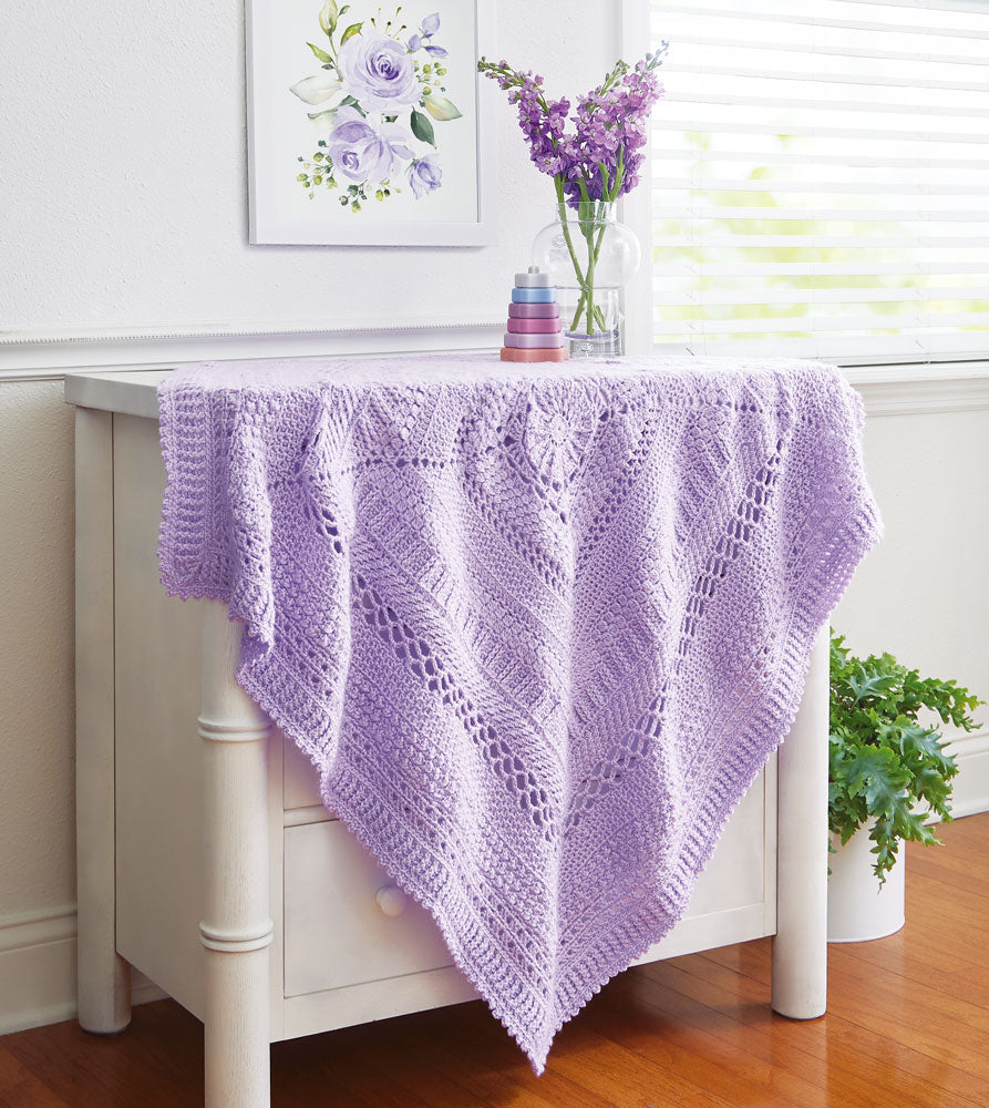 Designed by Ruth Hunter. A granny square becomes something beautiful for baby in this lovely blanket. Requires crochet hook size 7. Size 39 x 41". Intermediate Crochet.