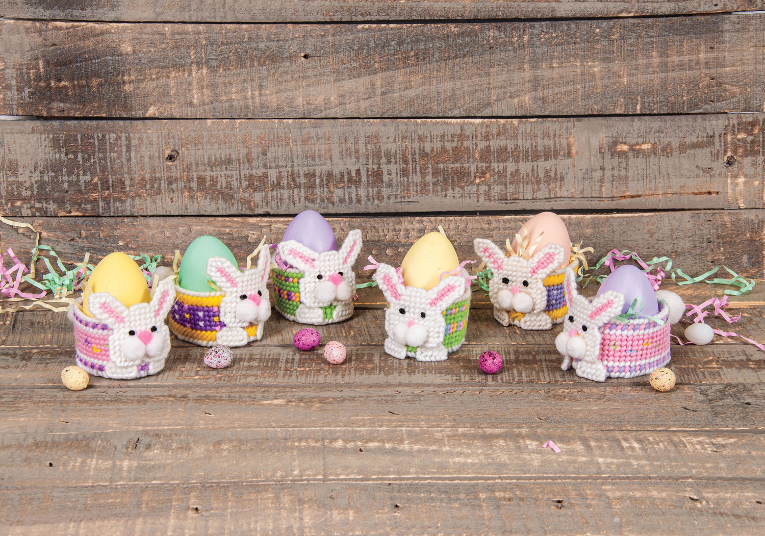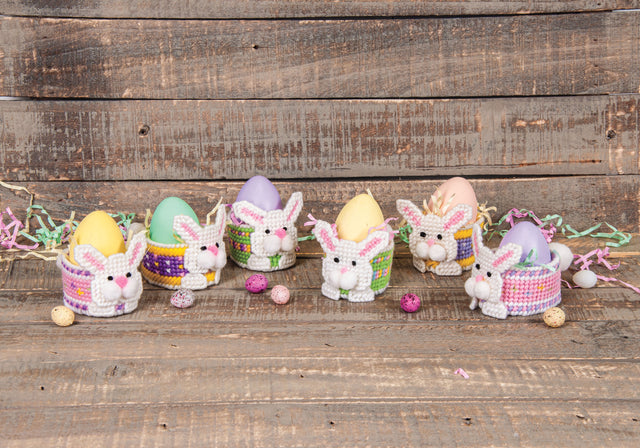 Adorable baskets to hold your Easter eggs. Kit includes 7 mesh plastic canvas, acrylic yarn and pattern to make set of 6 as shown. Eggs not included. Size 2.5 x 3 x 1.25".