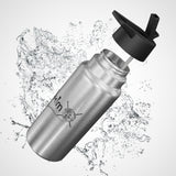 .: Materials: stainless steel bottle, black plastic screw-on cap