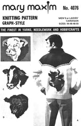Knit this cardigan with our vintage, graph-style pattern for the cowpokes in your family. Graph pattern includes raglan sleeve instructions and choice of three collar styles: shawl, windbreaker, or flat. Jersey, Holstein, Hereford, and Angus graph designs are also included. The original project was made with Mary Maxim Northland or Titan yarn, which had 80 yards per skein. We have a wonderful selection of bulky-weight yarns to choose from, including Mary Maxim Titan! Keep in mind yardages vary. Materials List: MC Sz 44-46 (10 skeins), Sz 48-50 (12 skeins). All Sizes: CC1 (5 skeins), CC3, CC4, CC5 and CC6(1 skein each). CC2 Size 44-46 (6 skeins), Sz 48-50 (7 skeins). Also requires knitting needles size U.S. 6 (4.25 mm) and 9 (5.50 mm). Fits sizes 44-46-48-50—Intermediate knit. Round up yourself a herd of cow cardigans for the whole family! Also available in sizes 32-36 and 38-44.