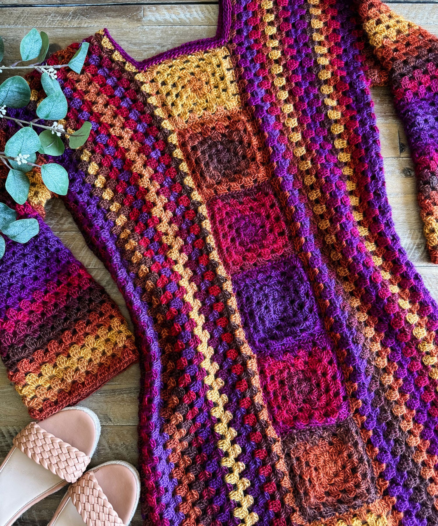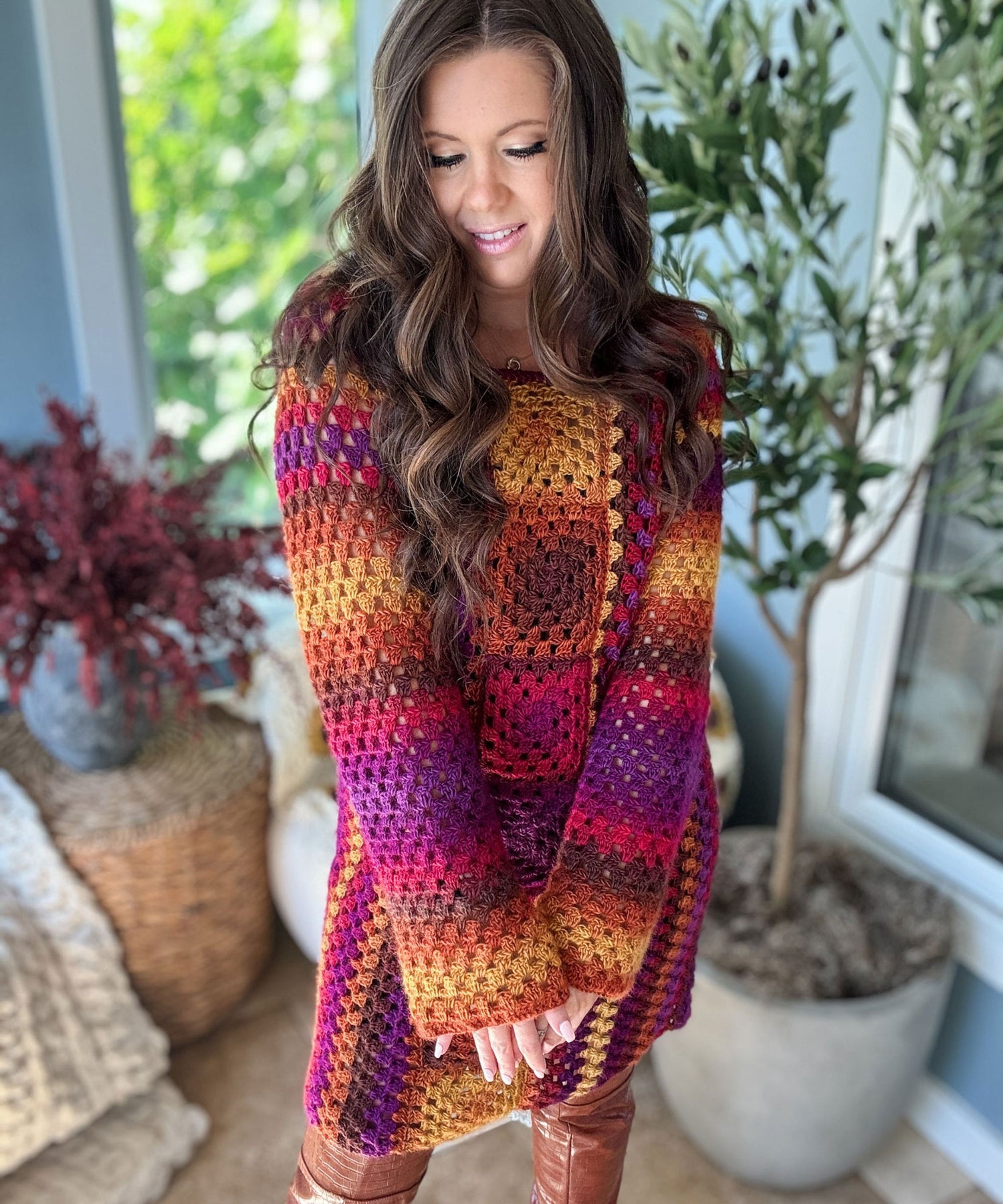 Designed by MJ's Off The Hook. Worked from side to side, this colorful dress has charming Granny Squares at the front and back and an enhancing neckline. Pattern also includes mini length if desired. Kit includes Mary Maxim Prism yarn and pattern. Requires crochet hooks sizes 7 and H-8. Intermediate Crochet.