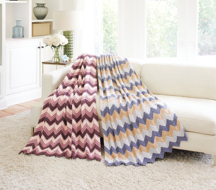 Knit or crochet this classic ripple afghan. Kit includes Mary Maxim Mellowspun DK yarn and pattern. Requires 36" circular needle size 8 or crochet hook I-9. Size 45" x 57". Easy Knit or Crochet.