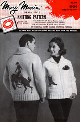Knit the Rodeo cardigan with our vintage pattern for the cowboy in your life. Picture graph patterns include raglan or set-in sleeves, zippers, or button-front instructions. The original project was made with Mary Maxim Northland or Titan yarn, which had 80 yards per skein. We now offer a great selection of bulky yarns to suit your style. Be aware yardage may be different. We recommend Mary Maxim Titan, our best-selling bulky weight, for this project! Materials List: MC Sz 38 (44 oz.), Sz 40-42 (48 oz.), Sz 44 (52 oz.). CC1, CC2, CC3 All Sizes (4 oz. Each color). You'll need U.S. 7 (4.5 mm) and 10 (6 mm) needles to bring it together. Fits sizes 38-40-42-44—Intermediate knit. Also available in smaller sizes!