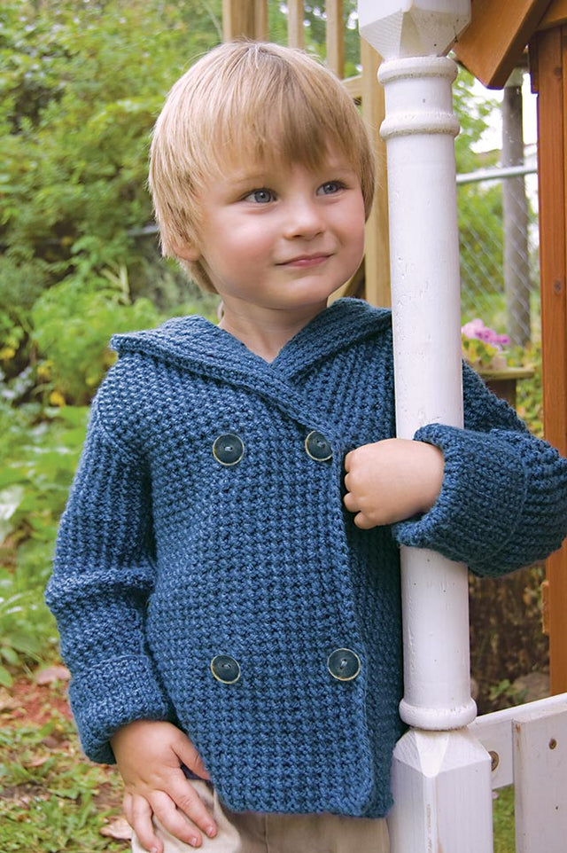Knit this kid's hoodie using Mary Maxim Starlette Yarn. Size 2 requires 4 balls, Size 4 requires 5 balls, Size 6 requires 6 balls and one pair knitting needles size 8 (5.00 mm).