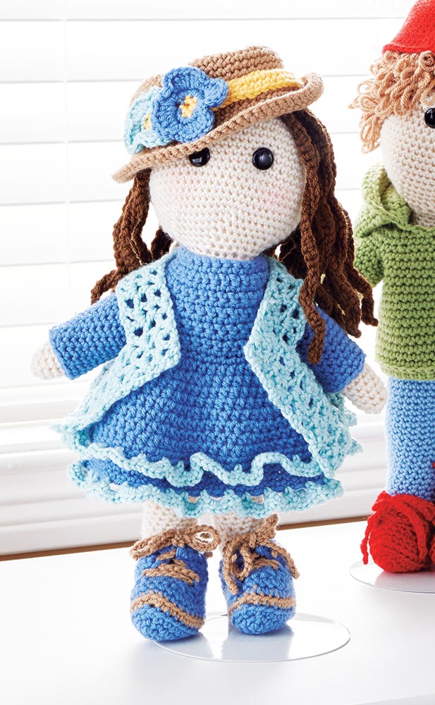 Crochet this doll & outfit using DK/Sport weight yarn. Requires two 1/2" black buttons, two 9mm buttons and crochet hook size D-3 (3.00 mm). Finished doll size 13" tall.