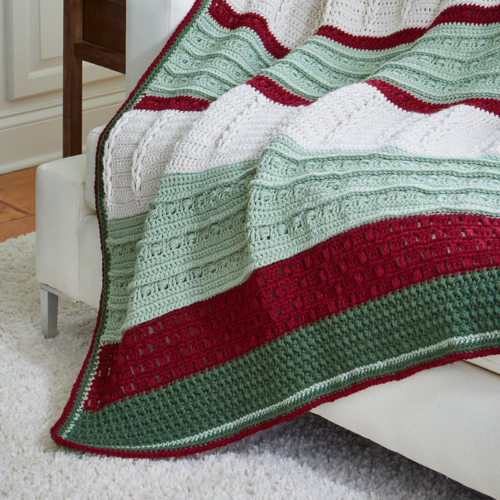 A medley of stitches to crochet. Kit includes worsted weight yarns and pattern. Finished size 48" (121.92 cm) x 57" (144.78 cm). Skill level: Intermediate crochet. Requires Crochet Hook J-10.