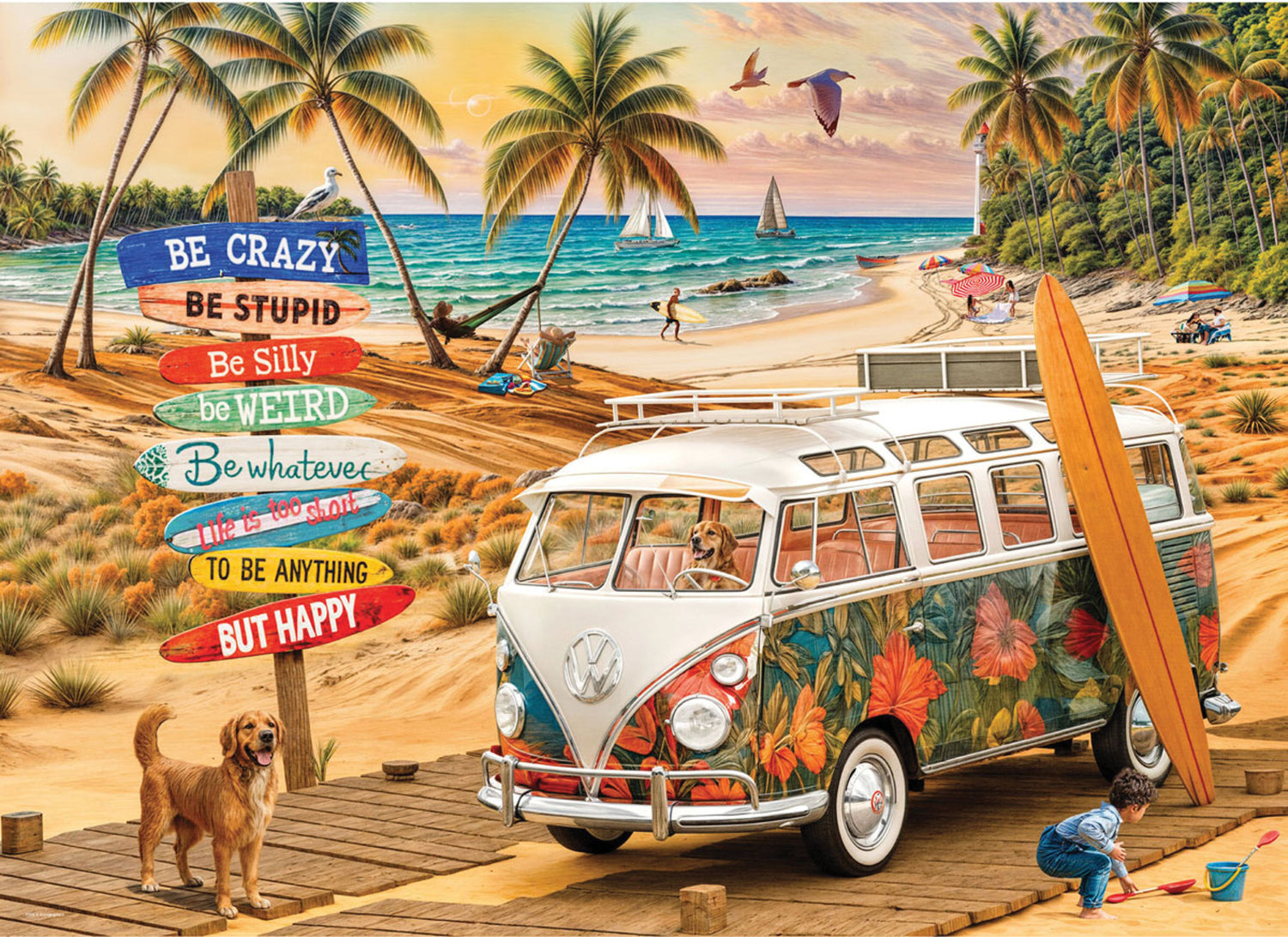 Catch the good vibes with this groovy 1000-piece jigsaw puzzle featuring a classic VW bus parked on a sun-soaked beach, complete with a surfboard ready for adventure. Perfect for puzzle enthusiasts and beach lovers alike, this 26.5 x 19.25" puzzle delivers hours of relaxing fun as you piece together this iconic retro scene. Whether you're a seasoned puzzler or looking for a chill activity to share with friends, this feel-good design brings coastal charm and nostalgic flair to your table.