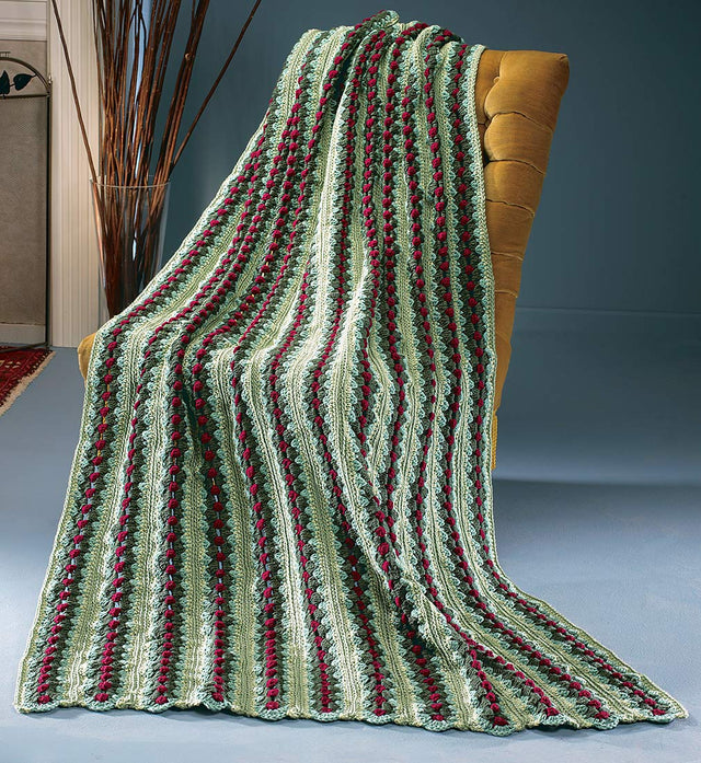 350Craft this charming Winter Berries Afghan using Red Heart Super Saver worsted weight yarn, ideal for cozying up during the holidays or throughout the winter season. This delightful afghan offers warmth on chilly days and is designed with yarn that provided 350 yards per skein in solid colors. While Red Heart worsted yarn remains available, you can also select from various other brands of worsted yarns to suit your project. Remember, yardage may differ depending on the brand you choose. Materials List: Dk Sage Green (3 skeins), Lt Sage Green, Spruce Green, Frosty Green (2 skeins each), Claret (1 skein), and crochet hook size I/9 (5.50 mm). Finished sizes 42 x 62" (106.5 x 157.5 cm)—Intermediate crochet.