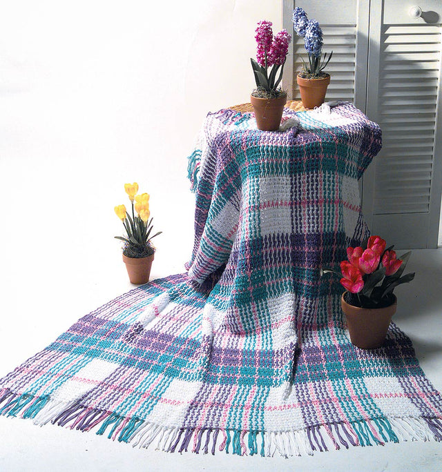 Classic plaid afghan pattern. Base is first crocheted into a mesh, then yarn is woven into the mesh to create the plaid effect. This design was created using Lily Sugar 'N Cream sport weight yarn, which offered about 125 yds per skein at the time. You can recreate this with any of our sport weight yarn we carry today. Just keep in mind yardage will vary. Materials List: MC White (11 balls), Pink (4 balls), Lavender (6 balls), Aqua (5 balls), and crochet hook size G/6 (4.50 mm). Finished size 45 x 61" (114 x 155 cm)—Easy crochet.